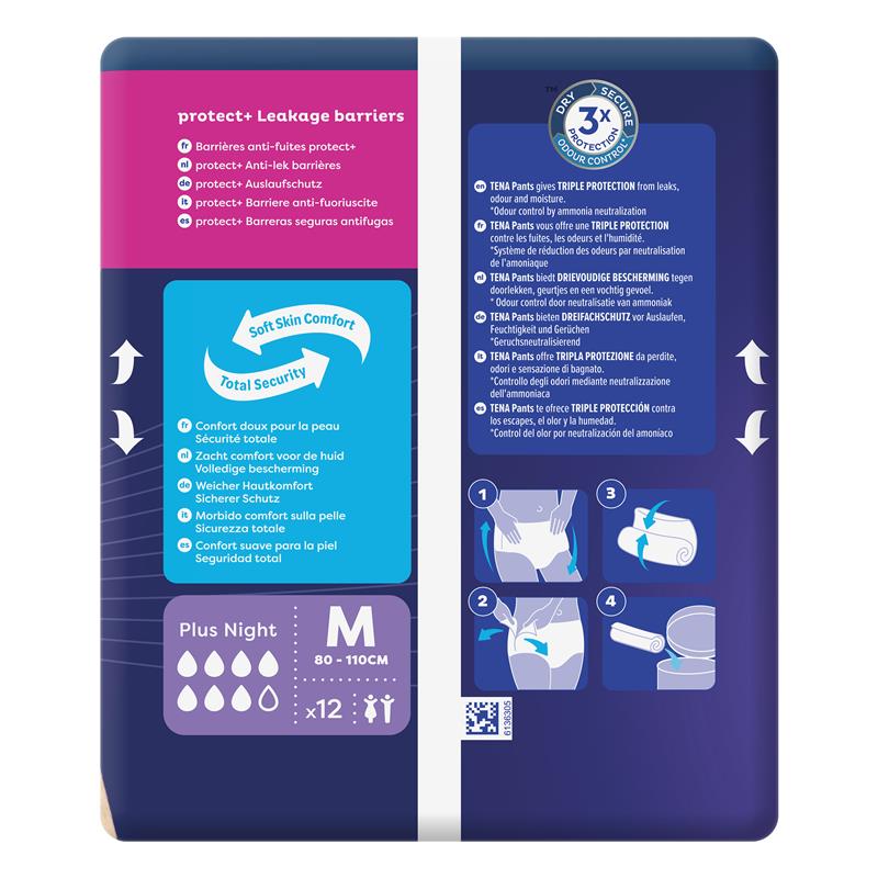 Secure, dry and with odour control* thanks to ammonia-reducing technology, TENA protect+ Pants Plus Night offer the maximum comfort, protection and confidence for a dry, worry-free night’s sleep. Complement your TENA Pants protect+ Night with TENA Pants protect+ Day for total protection all through the day and night.