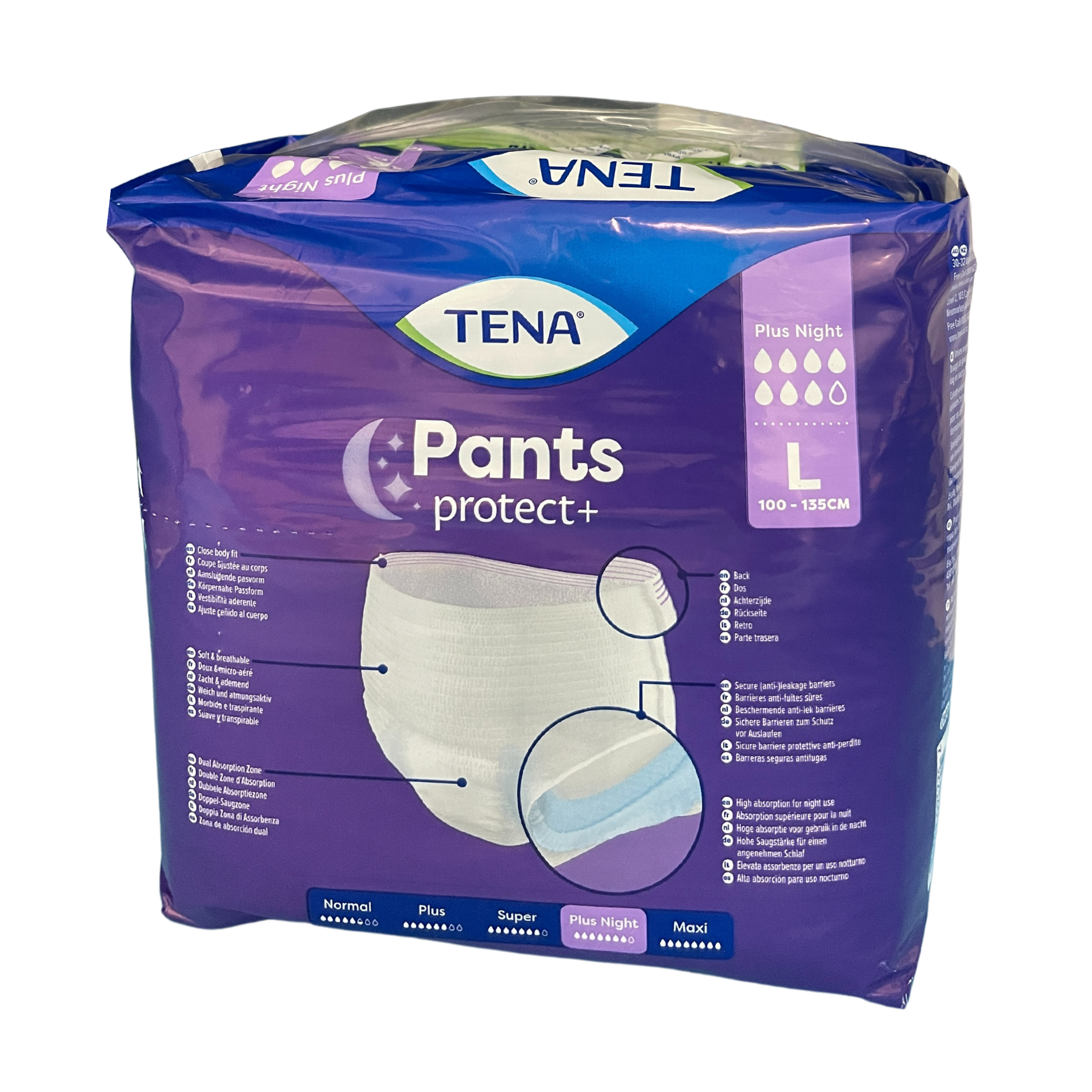 TENA Pants protect+ Plus Night are superior, unisex incontinence pants for up to 100% security against moderate to heavy bladder incontinence throughout the night. With dual absorbency and a flexible shape, maximum comfort is ensured for a worry-free sleep. Our most absorbent pants range yet, they are the trusted disposable incontinence pants, specially made for nighttime use by both women and men.