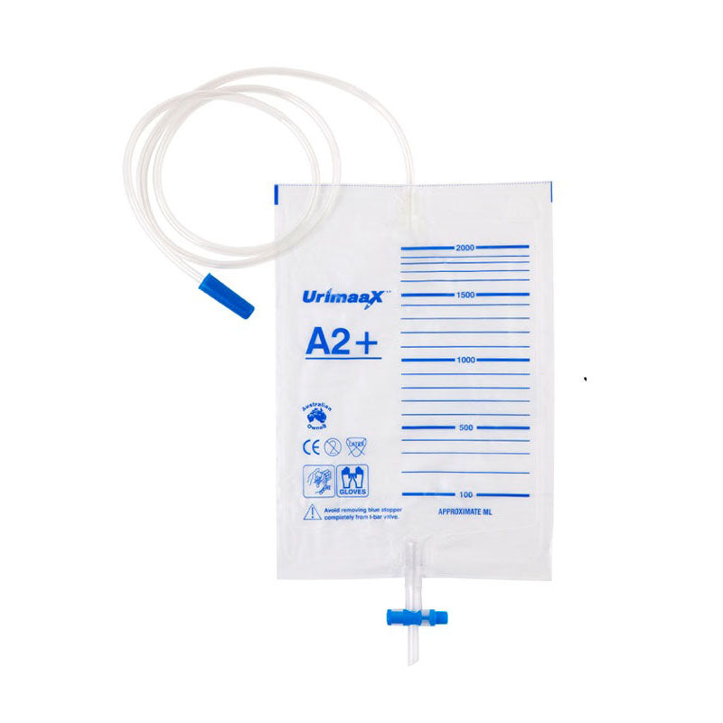 Urimaax Drainage Bag B/Drain T-Bar is a large capacity 2000ml drainage bag with a bottom T-bar drain and a universal stepped catheter connector. This system has a graduated front with a white frosted backing to allow easy visual readings and hanger holes that fit universal plastic or metal hangers. Ideal for use with Urimaax Drainage Bag Accessories.
