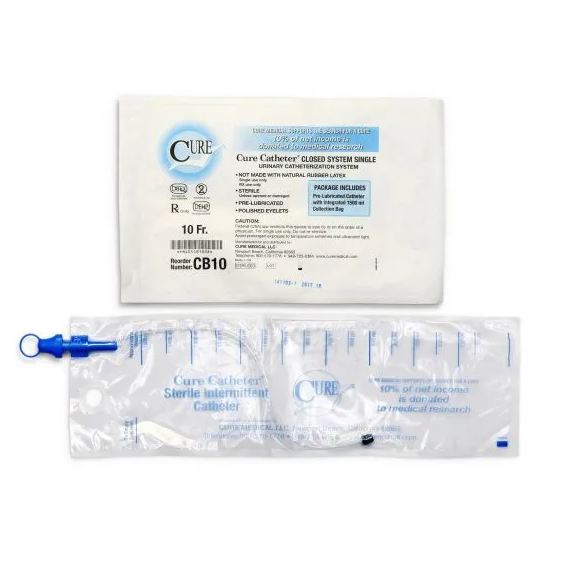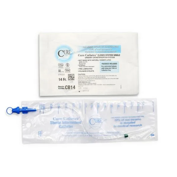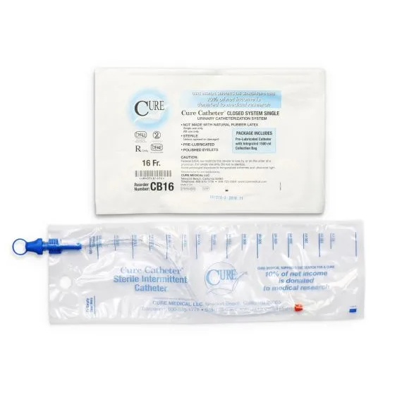 The sterile, single-use Cure Catheter® Closed System features fire polished eyelets on a pre-lubricated catheter tip with integrated 1500 ml collection bag.