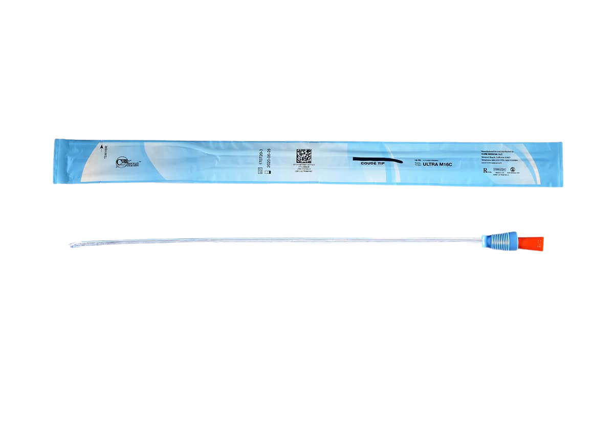 The Cure Ultra® Catheter for men is convenient and ready-to-use. This pre-lubricated catheter has a bent tip and a blue control stripe to help with insertion. The small package has an easy-tear top and minimum waste material. The Ultra features a proprietary CoverAll™ application process for even distribution of lubricant when removing catheter from the package. It has smooth, fire-polished eyelets, a “No Roll” connector/funnel end, and a unique gripper sleeve for control of the catheter without touching the tube itself. Made with high-quality soft materials, Cure Ultra® catheters will not kink when you bend them.