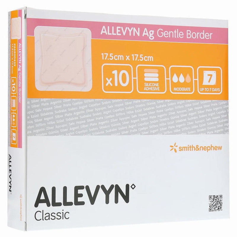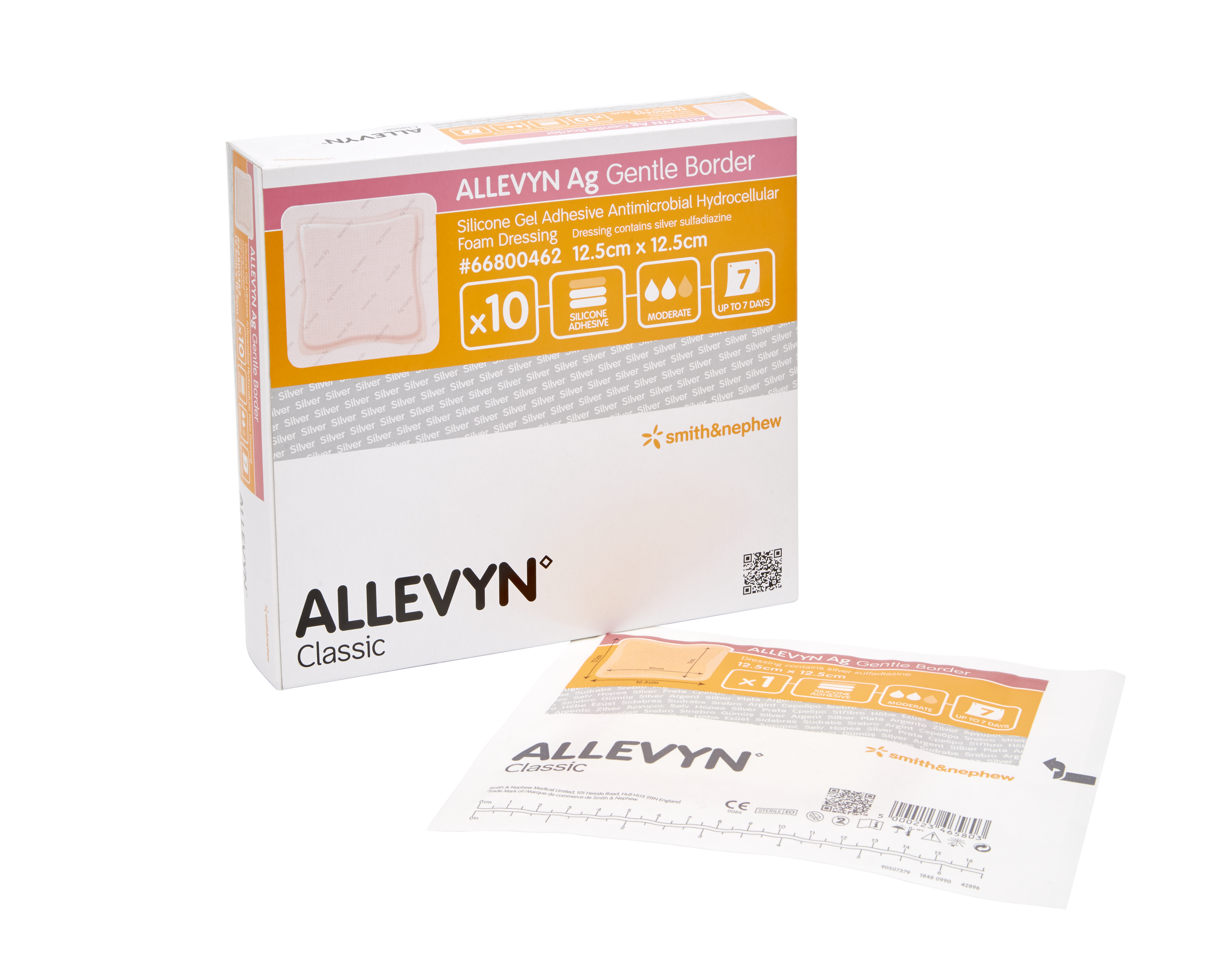 Smith & Nephew Allevyn Ag Gentle Border Dressing is designed for optimally managing exudate, including a unique two-in-one solution for exuding chronic wounds and providing a rapid and sustained antibacterial action. This foam dressing lowers the pain and trauma during dressing changes. Allevyn Ag Gentle Border is ideal for use on exuding partial and full wounds such as diabetic ulcers, decubitus ulcers , donor sites , and first and second degree burns, debrided and partially thick wounds, necrotic or sloughy wounds when used in conjunction with a hydrogel dressing and fragile skin.