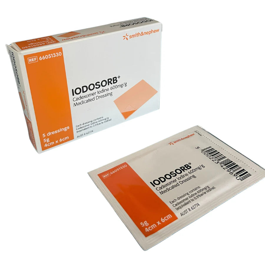 Iodosorb Dressin When applied to the wound, cadexomer iodine based products absorb fluids, removing exudate, pus and debris. As they swell, iodine is slowly released killing micro-organisms and forming a protective gel over the wound surface. Unlike povidone iodine dressings which deposit their iodine immediately upon application, the sustained release of iodine from cadexomer iodine dressings does not cause cytotoxic effects.