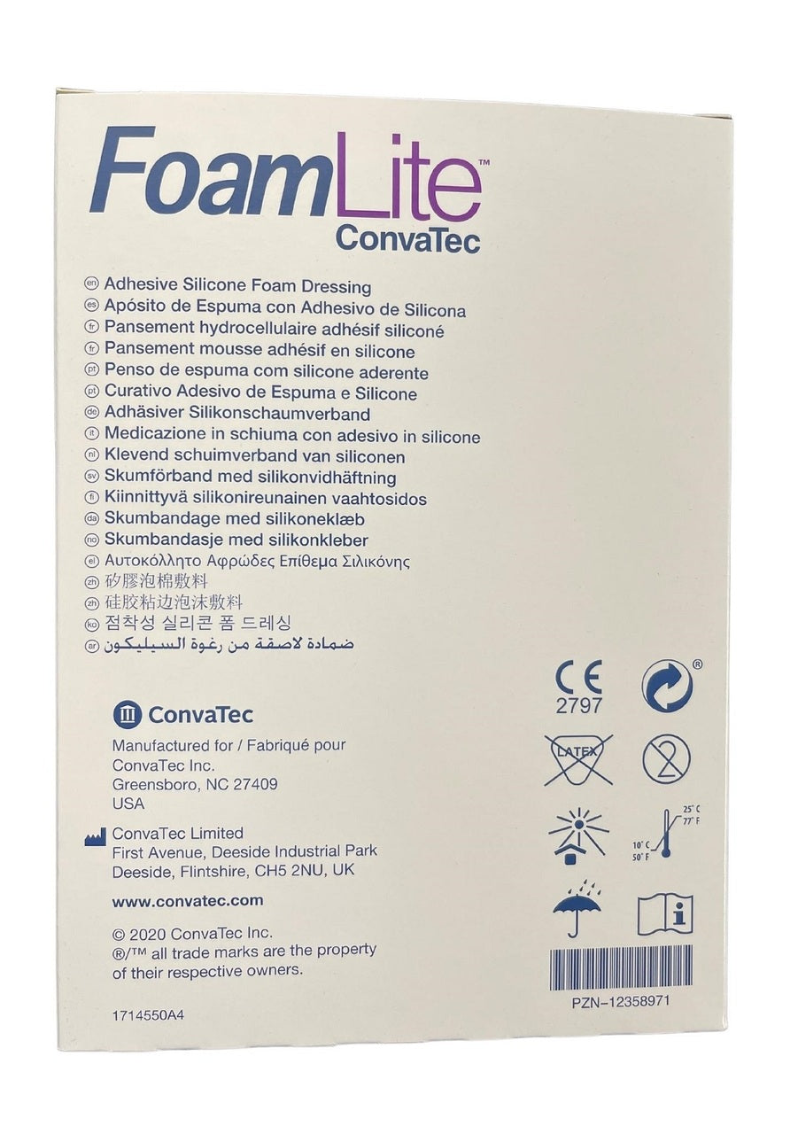 FOAMLITE 5.5CM X 12CM FoamLite ConvaTec dressings have been designed specifically for the management of low to non-exuding chronic and acute wounds. FoamLite ConvaTec dressing is a thin foam dressing with a breathable film and perforated, gentle, skin friendly silicone adhesive.1 FoamLite ConvaTec dressing is flexible and conforms1 to the body even in awkward locations. Features and benefits: - Flexible and conformable1 - Viral and bacterial barrier1 - Can be cut to shape - Soft, gentle and light - Adhesive does not stick to gloves or itself - Easy to apply, reposition and remove1, 2 - Water/shower proof1 - Maximum recommended wear time 7 days* Areas of use: Acute, chronic, low to non-exuding wounds such as - skin tears - skin abrasions - partial thickness burns Please refer to FoamLite ConvaTec dressing package insert for complete instructions for use As demonstrated in vitro 1. In Vitro Performance Characteristics of Foam Lite ConvaTec WHRI 4680 MS132. 25/04/16 Data on File, ConvaTec Inc. 2. Meuleneire F, Rücknagel H. Soft silicones Made Easy. Wounds International 2013 (May). Available from: www.woundsinternational