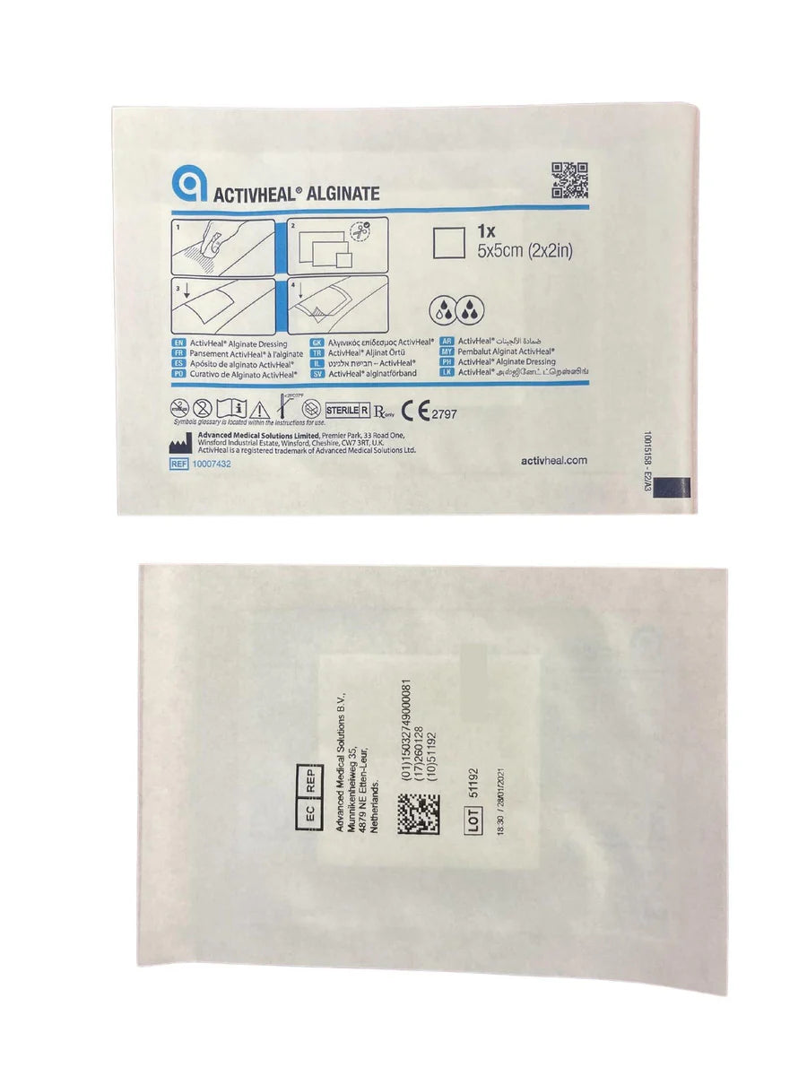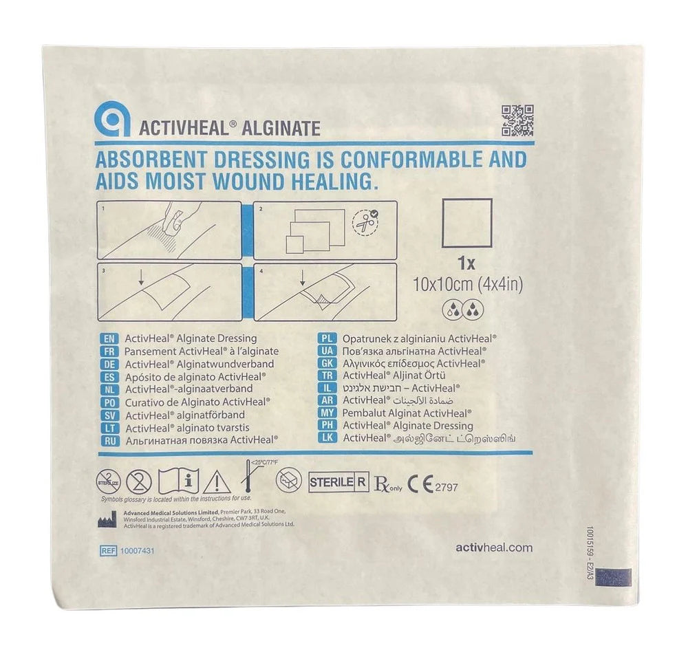Activheal Alginate is a sodium calcium alginate dressing indicated for the treatment of moderate to heavily exuding wounds as a primary dressing.