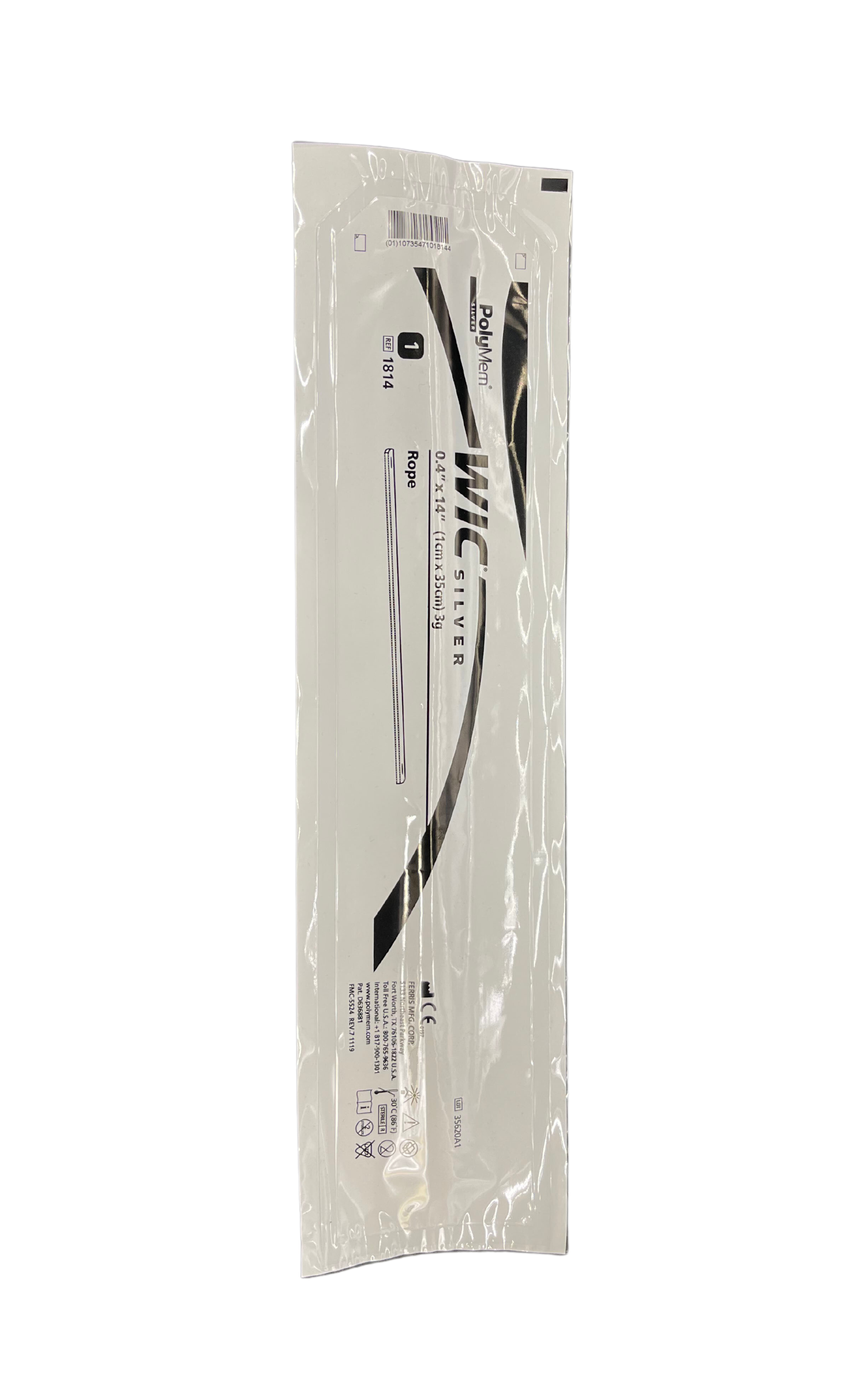 Ferris PolyMem WIC Silver Rope Wound Filler is specially designed for tunneling wounds. It is made of the hydrophilic polymeric membrane matrix and is reinforced with a medical grade mesh to enhance the strength of the dressing for use in deep tunneling wounds. As this is a wound filler, to be used only as a primary dressing, this configuration comes without the thin film backing.