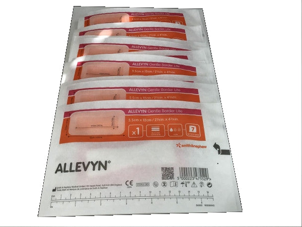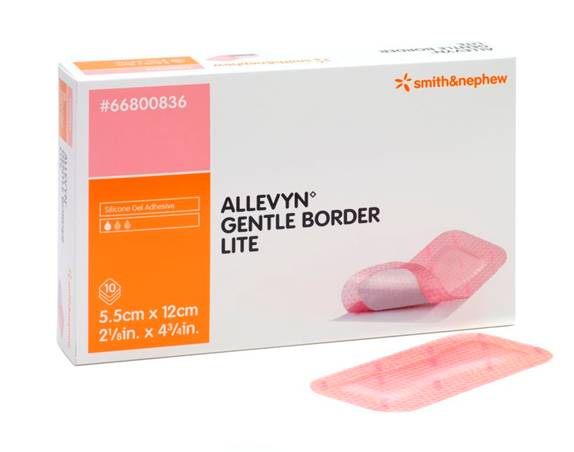Allevyn Gentle Border Lite is designed for individuals who have sensitive or fragile skin with slightly to moderately exuding wounds. Allevyn Gentle Border Lite is a combination of a comfortable and conformable thinner foam and a gentle silicone adhesive minimizing your pain on removal. This dressing is used on low to moderately exuding wounds including shallow, granulating wounds, chronic and acute exudative wounds, fully and partially thick wounds such as pressure ulcers, leg ulcers and diabetic foot ulcers, malignant wounds, surgical wounds, first and second degree burns, donor sites, skin tears, fungating ulcers, oncological wounds and epidermolysis bullosa wounds.