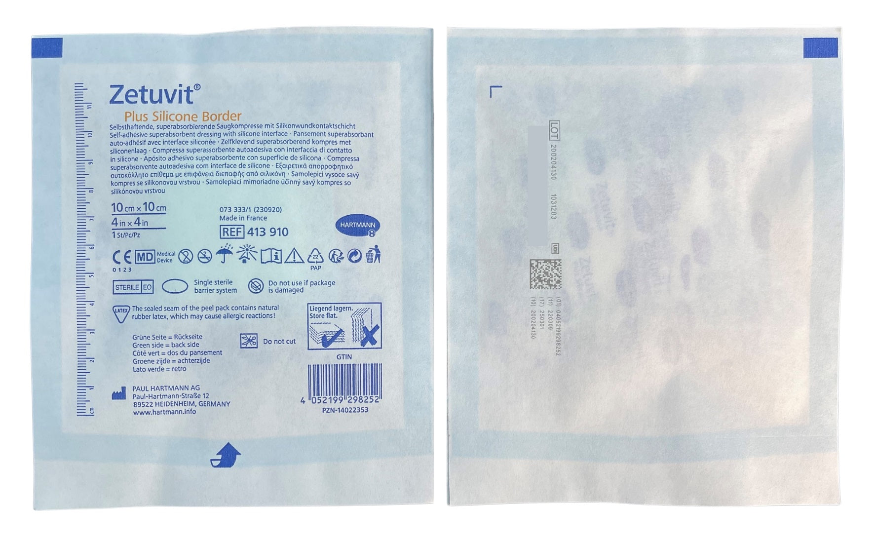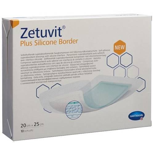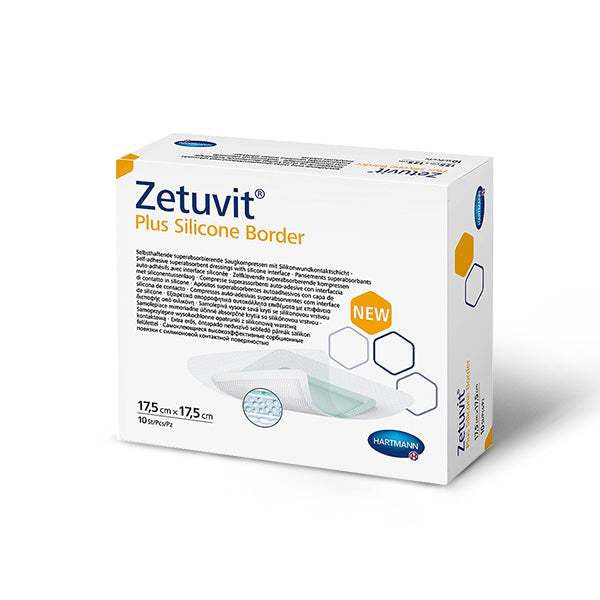 Zetuvit Plus Silicone Border is designed to prevent exudate-related complications and provide you with optimal moisture management. Zetuvit Plus Silicone Border does not require a secondary fixation dressing. It benefits from a transparent silicone border that protects the periwound skin and is designed to keep the periwound skin area visible, which can be cut to aid application when needed. In addition, Zetuvit Plus Silicone Border features a backing film which is showerproof, breathable, bacteria and viral proof. The blend of cellulose fluff and fluid retaining superabsorbent particles (SAP) means Zetuvit Plus Silicone Border is particularly suitable for treating heavily exuding acute and chronic wounds. Zetuvit Plus Silicone Border is ideal for use under compression. Furthermore, it avoids leakage and prevents maceration, even under compression.