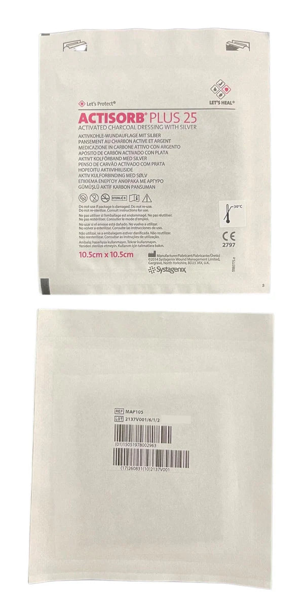 | MAP105 | Actisorb™ Plus 25 Activated Charcoal Dressing with Silver 10.5 x 10.5 cm |