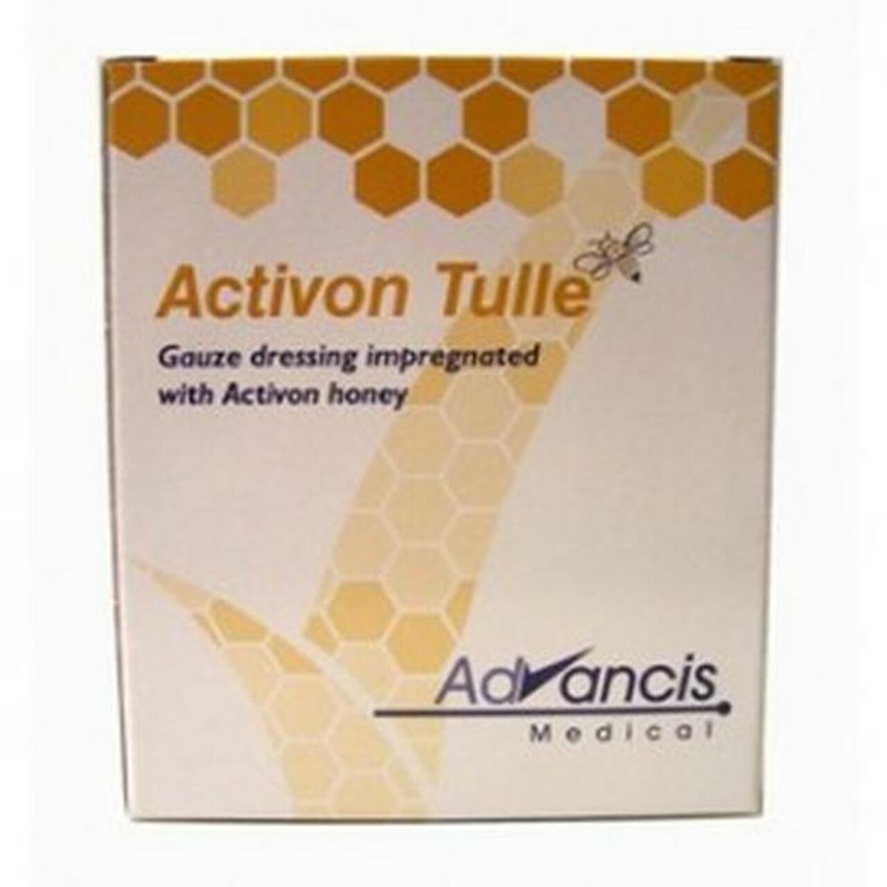 ACTIVON TULLE IMPREGNATED HONEY DRESSING 5cmx5cm Activon Tulle is a BP specification knitted viscose primary dressing impregnated with an optimum volume of Activon medical grade Manuka honey for effective wound treatment. Activon is pure honey with no additives which could cause an adverse reaction. It is produced to the highest possible hygiene standards to ensure its suitability for the treatment of wounds. Activon Tulle is designed to protect a wound, create a moist healing environment and form a barrier which effectively reduce or eliminate wound odour. Through osmotic action attributable to the high sugar levels in the antibacterial Manuka honey, exudate will be drawn from the wound into the dressing, which promotes autolytic debridement. Activon Tulle will maintain a moist environment and will help improve the condition of the wound bed.