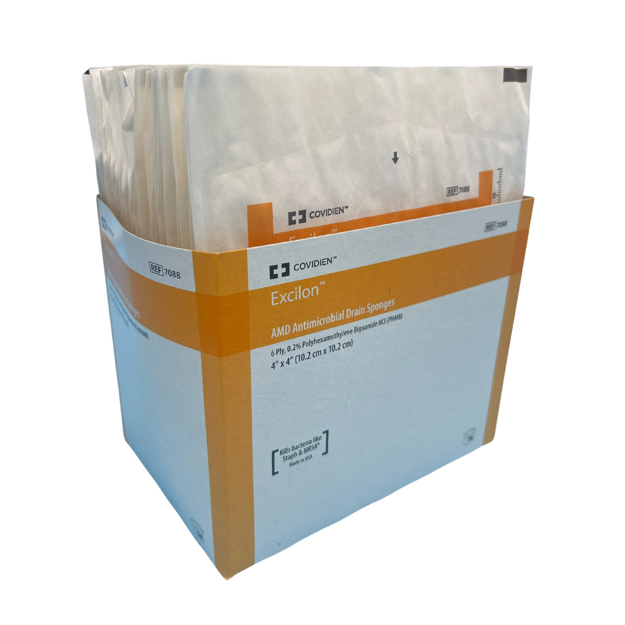 Covidien Excilon AMD Antimicrobial Non-Woven Drain Sponges 4"x4" (10.2cm x 10.2cm), 6 Ply, (Pktx2), 0.2% Polyhexamethylene Biguanide HCI (PHMB), (code: 7088)