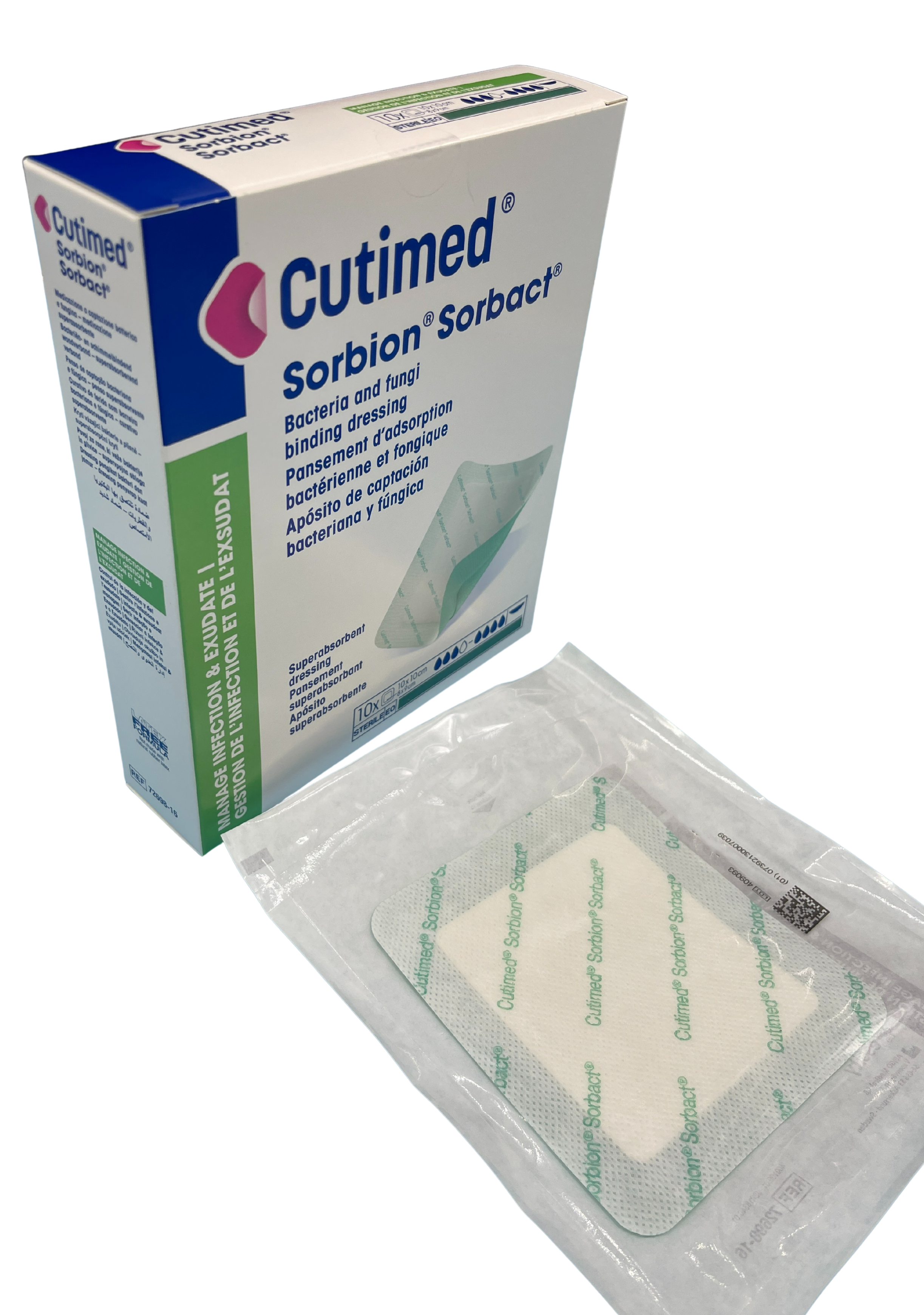 Sorbact® Superabsorbent is a sterile, bacteria and fungi binding, superabsorbent wound dressing. It consists of a green Sorbact® wound contact layer combined with a superabsorbent core and a white water repellent backing to prevent exudate strike through. Sorbact® Superabsorbent is intended for use in management of clean, colonized, contaminated or infected wounds with high to excessive exudate levels, such as surgical wounds, traumatic wounds, pressure ulcers, diabetic ulcers and foot and leg ulcers.