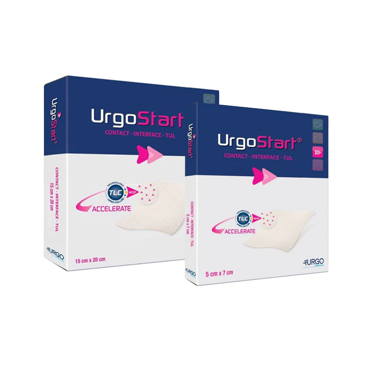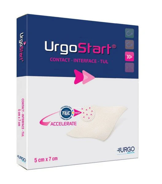 UrgoStart Contact is a flexible contact layer with TLC-NOSF comprised of a conformable polyester mesh impregnated with hydrocolloid (Technology Lipido-Colloid) and NOSF particles (Nano-Oligo Saccharide Factor). REDUCES WOUND HEALING TIME WHILE GENERATING SAVINGS- Reduces wound healing time and avoids wounds becoming longstanding - Is cost-effective- Improves patients quality of life Indications: UrgoStart is indicated in the treatment of non-infected chronic or recurring wounds with a moderate to heavy level of exudates (ie. leg ulcers, pressure ulcers, diabetic foot ulcers). UrgoStart can be left in place for up to 7 days depending on the level of exudates and the clinical condition of the wound.