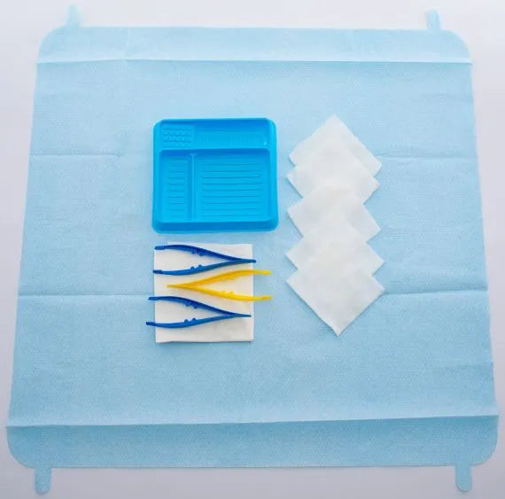 QLD type contains: 1 Sterile Field; 1 Dressing Tray; 1 Paper Dressing Towel; 1 Yellow & 2 Aqua Dressing Forceps; 5 Non-Woven Swabs 7.5 × 7.5cm; Plastic Bag Pack; Upright Tray
