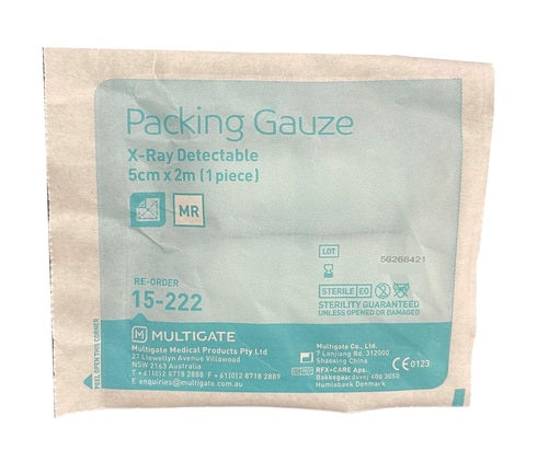 Multigate X-ray Detectable Packing Gauze is made from 100% cotton and designed for use during open surgical procedures. A blue X-ray detectable thread has been bonded to the gauze. Multigate X-ray Detectable Packing Gauze has a high absorbency, and consequently is appropriate for packing deep wounds, tunnels and undermining.