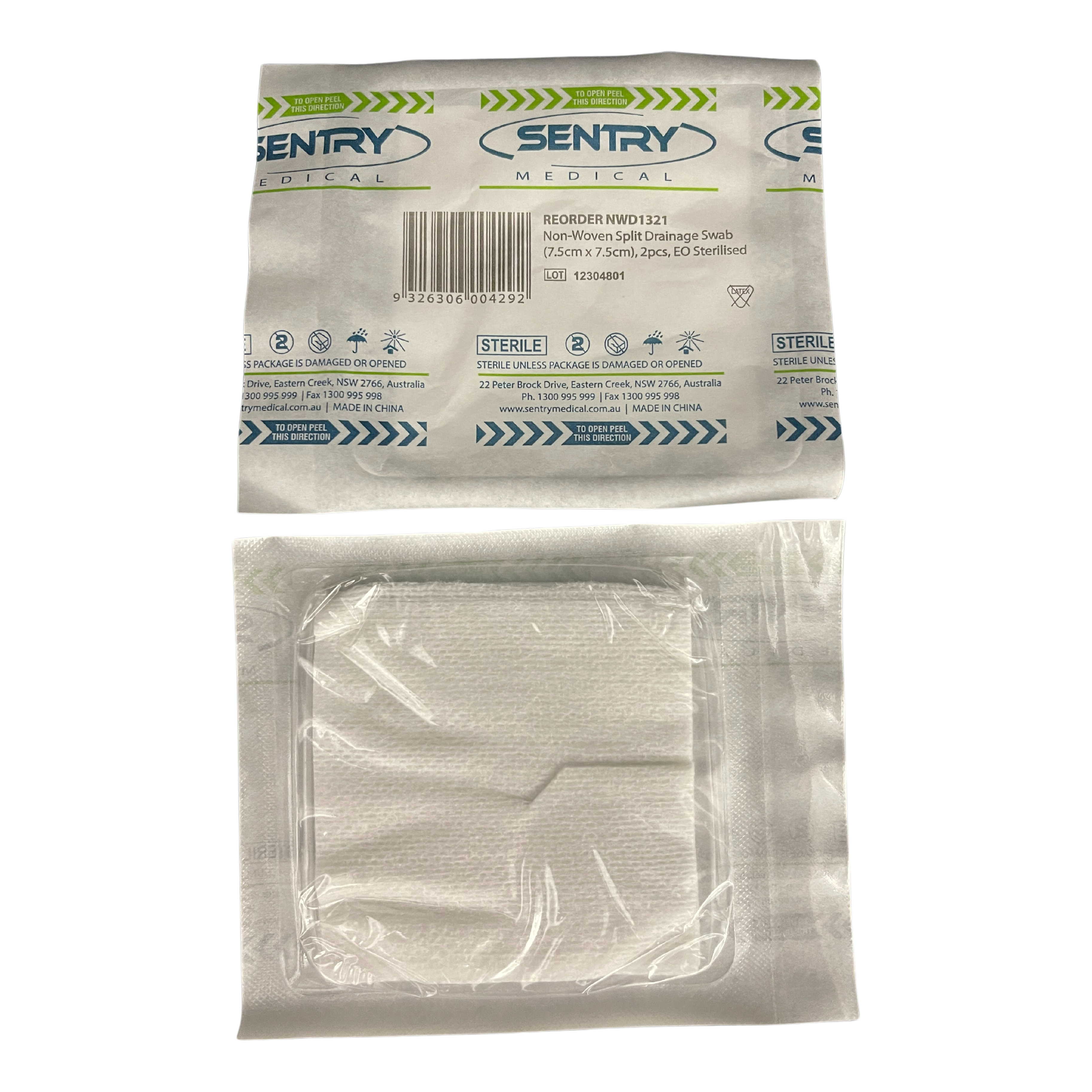 Sentry Medical Non-Woven Split Drainage Swabs are constructed from a polyester and rayon blend. They have four times the absorbency of conventional cotton gauze and are low linting. Cut with a Y split for easy placement around drains, they require no cutting and are ready to use.