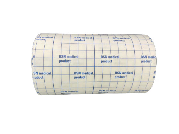 Made from a white, stretchable, nonwoven polyester dressing sheet coated with skin-friendly polyacrylate adhesive on quick-release backing paper.