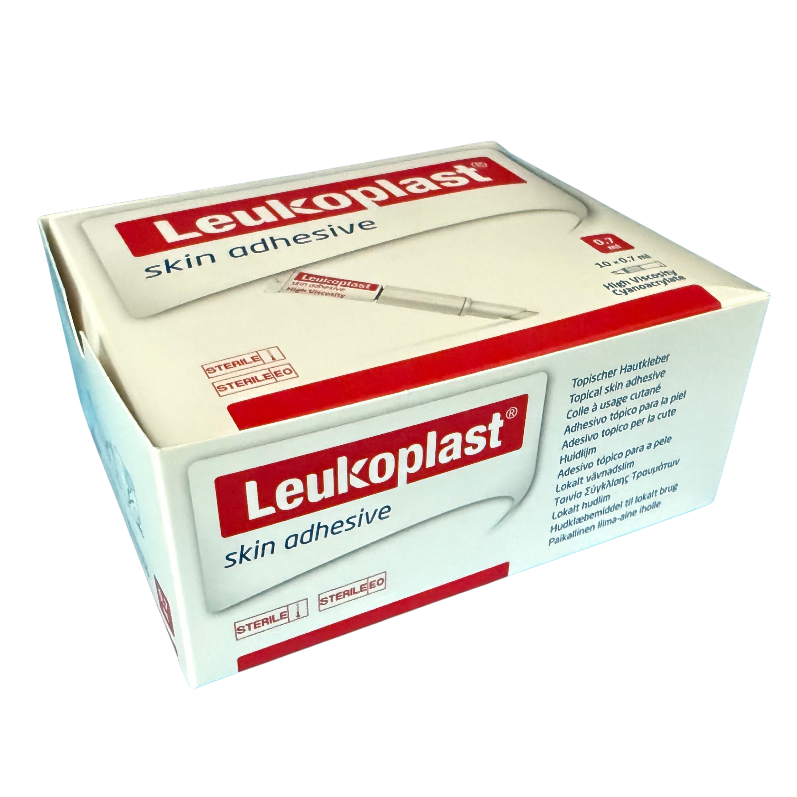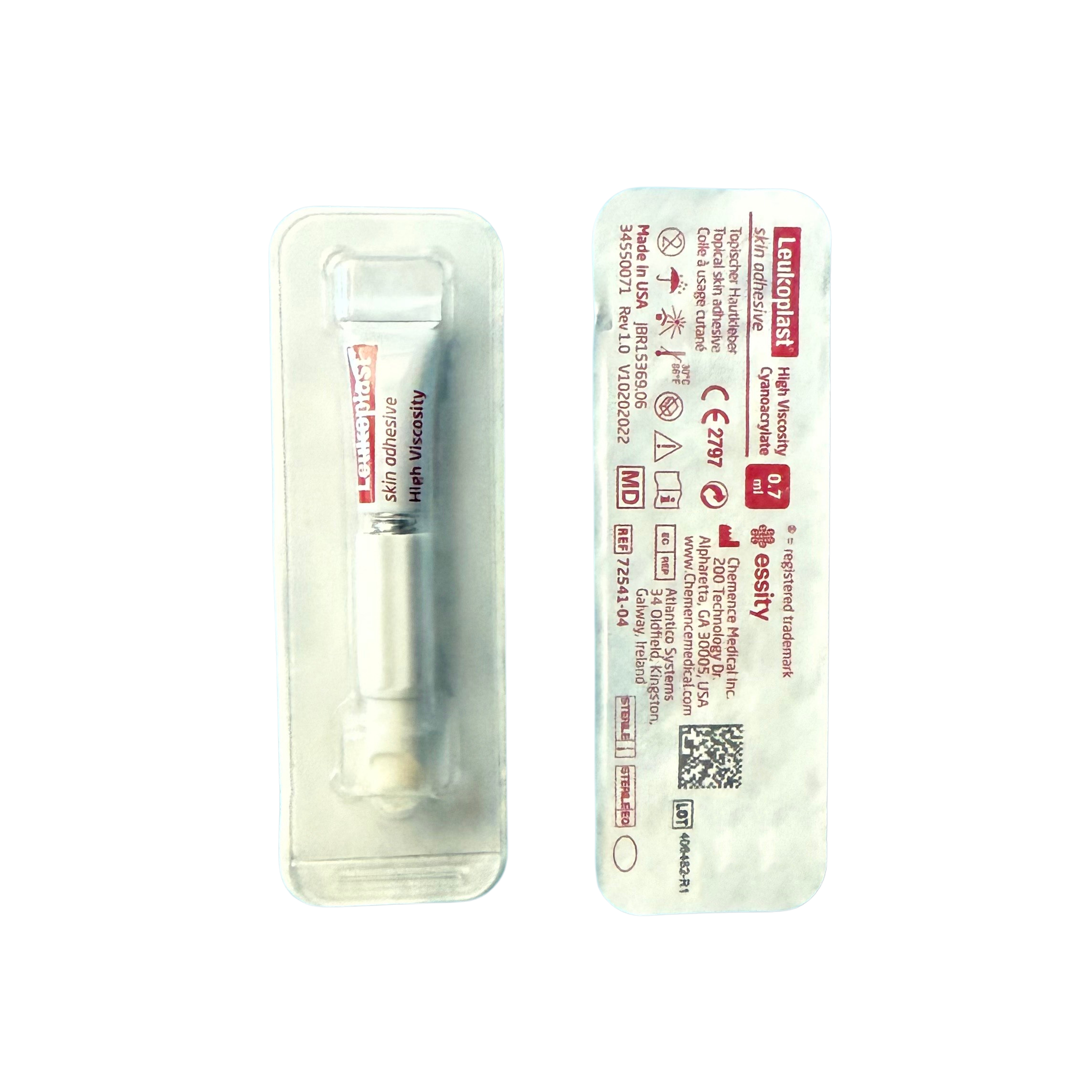 BSN Medical Leukoplast Adhesive Glue - 0.7ml BSN Medical Leukoplast Adhesive condenses all advantages of conventional skin adhesives into an innovative aluminium tube. Its highly viscous and quick setting cyanoacrylate adds major improvements to the benefit of patient and practitioner. Leukoplast SKIN GLUE Description A topical skin closure adhesive formulated from a patented blend of 2-octyl and n-butyl cyanoacrylate monomers. Features . Presented in a metal tube with two separate applicators . High viscosity glue allows for exact and easy application . One layer suffices to provide strong, reliable wound closure . Provides a highly flexible, protective film on the skin surface . Low to no heat sensation in contact with the skin Benefits . The two applicators allow you to select the most suitable one to provide precise and/or protective application . Flexes with skin, reliable adaption and protection of wound . Pain-free, patient comfort, child-friendly